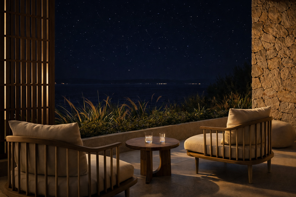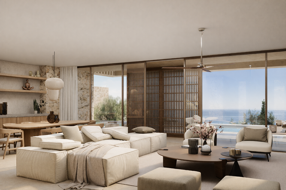 The interior spaces extend seamlessly to the outdoor terraces and pool area, creating a continuous living experience between architecture and landscape. Carefully selected materials and soft architectural lighting enhance the natural textures, creating a calm and refined atmosphere.